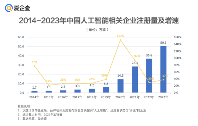爱企查数据显示,近十年来,中国人工智能相关企业注册量呈快速增长态势。目前我国有企业状态为“开业”的人工智能相关企业160.78万家,其中成立于近五年的有135.55万家,占比达84.31%。2020年我国人工智能相关企业注册量同比增长152%,达近十年增速峰值。